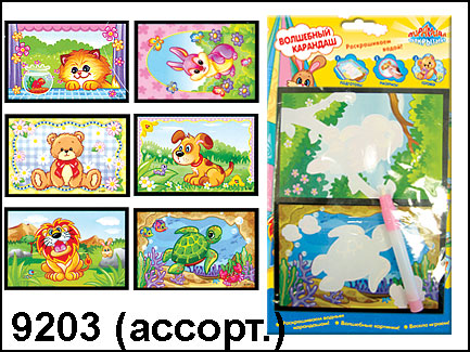 В наборе 2 две картонные картинки размером 14Х10 см. и водный карандаш.