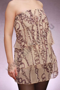 Очаровательное платье - бандо прилегающего силуэта. Украшено принтом в виде цепей. Передняя часть изделия декорирована многослойными оборками.