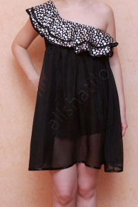 Легкая женственная туника с широкой бретелью на одно плечо. Украшено роскошными оборками в маленький белый горох.