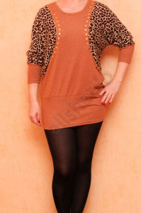 Платье-туника с леопардовыми вставками. Длинные рукава. Украшено паетками золотого цвета.