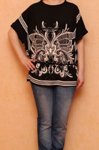 Очаровательная черная туника с короткими рукавами и округлым вырезом горловины. Туника декорирована контрастным принтом и тонким декоративным поясом.