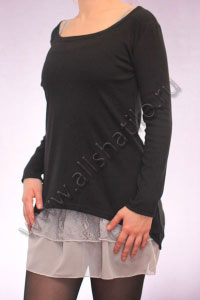 Очаровательный комплект, серая туника на двух тонких бретельках, по низу декорирована кружевом и оборками из шифоновой ткани. И черная кофточка с длинным рукавом и округлым вырезом горловины. Низ кофточка асимметричный.