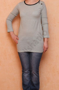 Замечательная туника с округлым вырезом горловины и длинными рукавами. Левое плечо изящно декорировано двумя пуговкам.