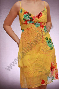 Очаровательное воздушное желтое платье с цветочным узором на тонких регулируемых бретелях. Сзади потайная застежка на молнию. Под платьем – непрозрачная подкладка.