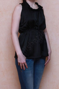 Эффектный черный топ с округлым вырезом горловины. Топ украшен очаровательными оборками из легкой ткани. Фигуру подчеркивает тонкий поясок на талии.
