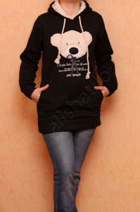 Удлиненный черный свитшот с капюшоном. Перед свитшота украшен изображением плюшевого мишки.
