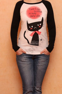 Джемпер с черными рукавами. Спереди рисунок с кошечкой.