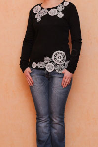 Изящная кофточка черного цвета облегающего кроя. Округлый вырез горловины и низ изделия декорированы изящным кружевом.