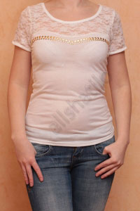 Роскошная белая кофточка с короткими рукавами и округлым вырезом горловины. Верхняя часть, включая рукава, выполнена из ажурного кружева. Украшено паетками золотого цвета.