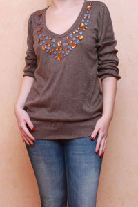 Эффектный джемпер с V-образным вырезом горловины и рукавами 7/8. Низ изделия притален. Джемпер украшен аппликацией из пуговиц и стразов.