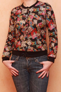 Милая и комфортная черная кофточка на пуговицах с изящным рисунком "комикс". Округлый вырез горловины. Рукава и низ изделия на резинке.