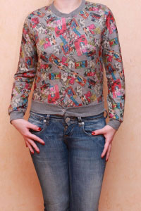 Милая и комфортная серая кофточка на пуговицах с изящным рисунком "комикс". Округлый вырез горловины. Рукава и низ изделия на резинке.