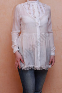 Элегантная белая блузка с застежкой на пуговицы и воротником "стойка". Блузка выполнена из легкой полупрозрачной ткани.